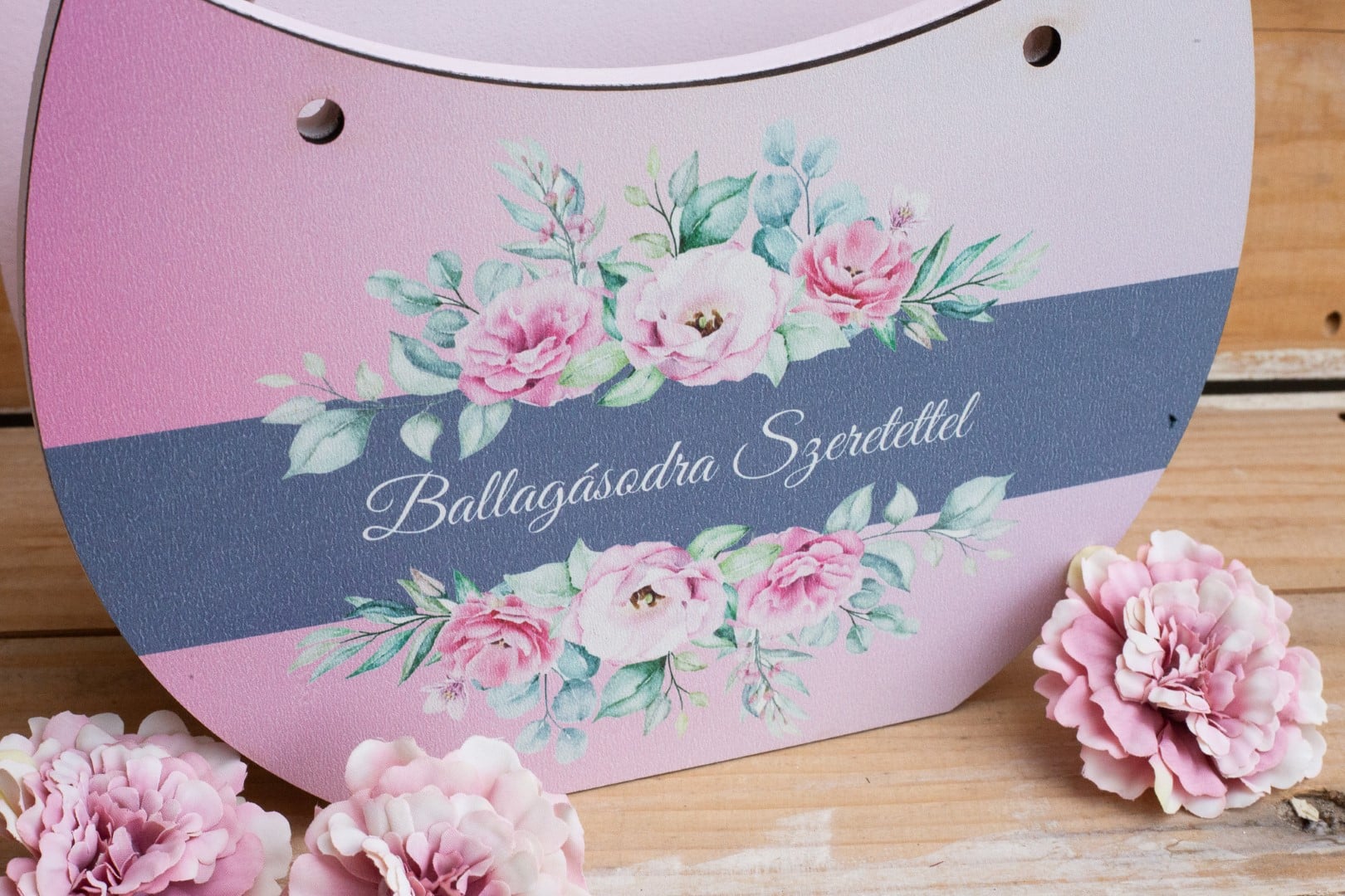 Ballagásodra szeretettel feliratos retikül virágbox