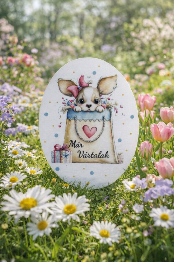 Kutyus zacskóban 13cm ovális ajtódíszbe való táblácska 3mm vastag